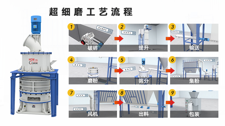 在离心力的作用下,材料被驱动到转盘的边缘,并落入研磨室。材料在研磨室内被辊子反复压制、粉碎、研磨。然后材料落入多层,不断粉碎,磨成微粉。